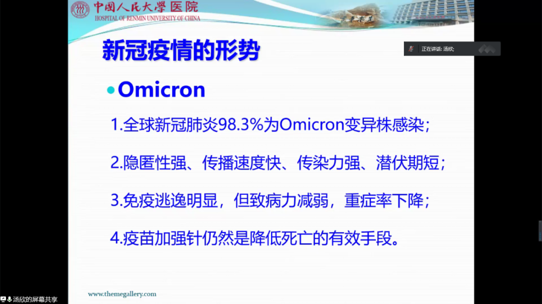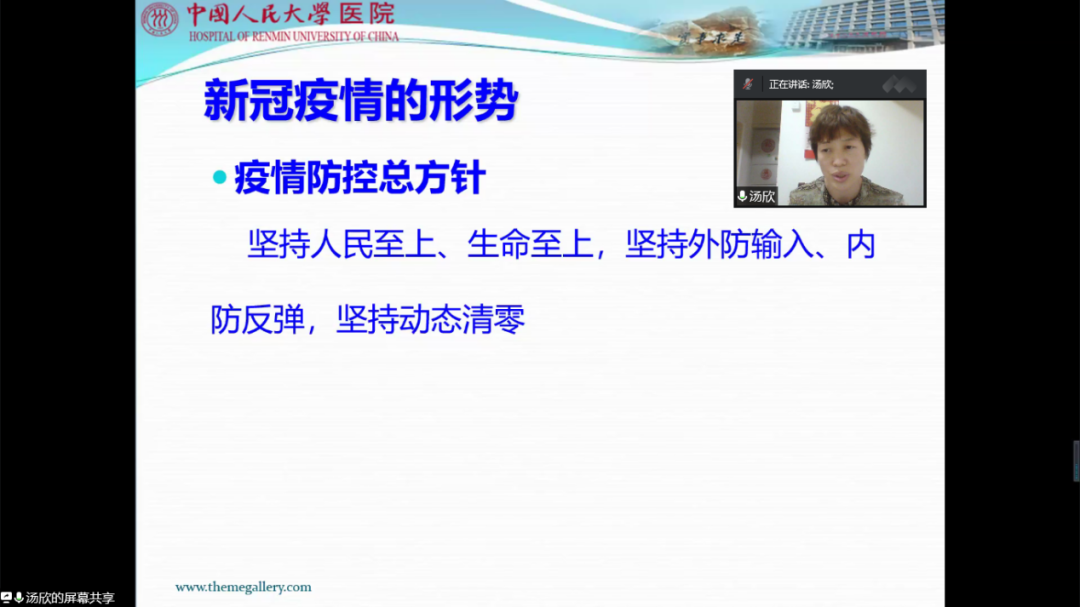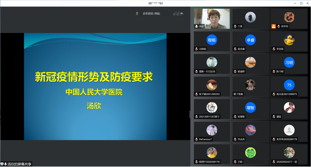 随后,汤欣副院长为我们分别介绍了新冠疫情的国际形势和国内形势,也就北京近期疫情及管控政策作出了阐释。她指出,多轮全员核酸和减少人员流动是防止疫情恶化的必要手段,为了打赢这场疫情防控阻击战,一定要居安思危,未雨绸缪。她还强调,要始终绷紧疫情防控这根弦,坚持人民至上、生命至上,坚持“外防输入、内防反弹”总策略,坚持“动态清零”总方针。