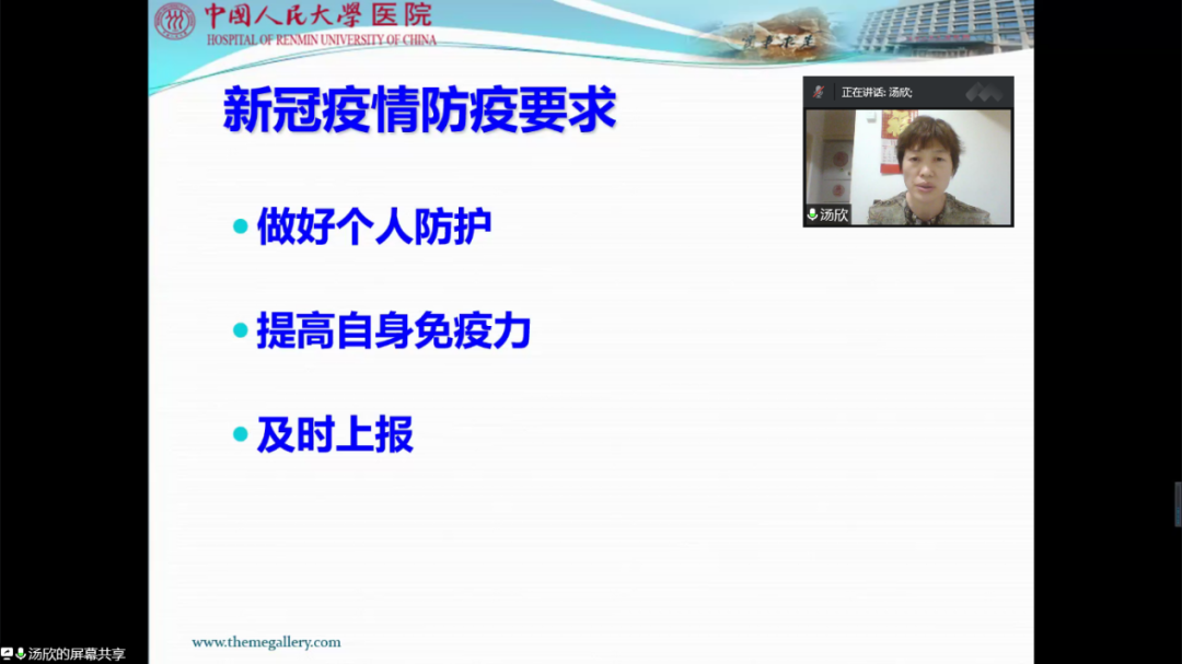 介绍完当前新冠疫情形势后,汤欣副院长就疫情防控提出了以下三点要求:一是做好个人防护,戴口罩,勤洗手,少聚集,多通风。汤欣副院长强调一定要正确佩戴口罩和用“七步洗手法”正确洗手,为大家播放了色情动漫 校医院制作的演示视频,并且亲自示范讲解。二是提高自身免疫力,规律作息、适当运动、营养均衡、健康心理。三是及时上报,要配合国家,配合社会,在疫情防控形势严峻时期自觉遵守防疫政策,提高自身防控意识。汤欣副院长希望大家在疫情关键时期再接再厉,共同打赢这场疫情防控阻击战。