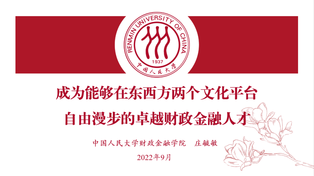 时间:2022-09-159月13日下午,2022级本硕博新生一同聆听了庄毓敏院长做的题为“成为能够在东西方两个文化平台自由漫步的卓越财政金融人才”的报告。