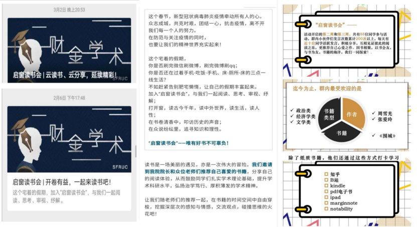 五是线上读书会。学院推出线上读书活动“启窗读书会”。自活动开展以来,共有88位同学参与此次活动,期间群内同学们发言总计500余次,同学们推荐分享书籍200余本,涉猎广泛。