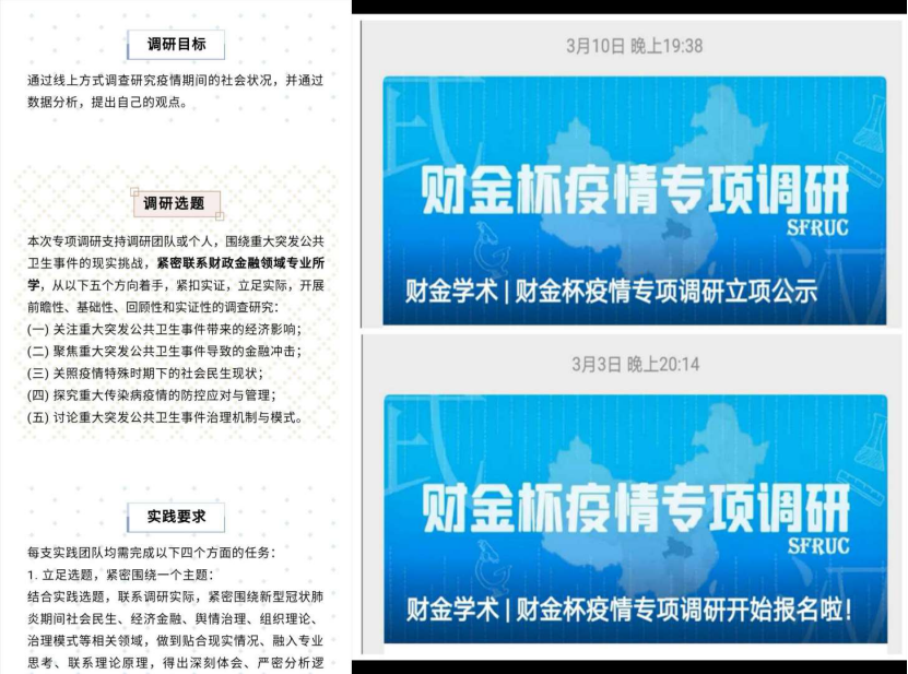 三是财金杯疫情专项调研,鼓励学生疫情期间结合专业学习以线上调研方式揭示实际问题背后的科学内涵和机理规律,紧扣实际短板、弱项和不足,努力聚焦突破经济金融领域、专业相关的基础性、根本性问题。