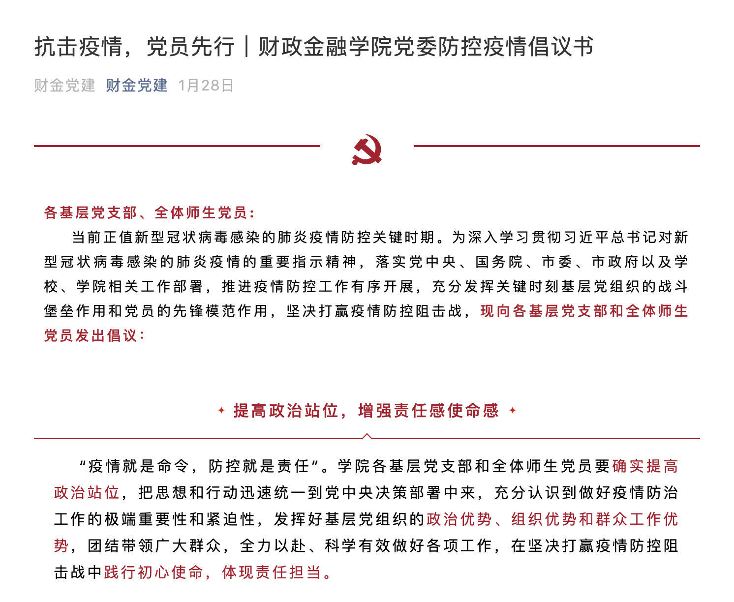 学院党委有号召,广大党员有行动。2月5日,财金党建微信公众平台在线发布《抗击疫情,财金党员在行动!》党员承诺书,短时间内即得到学院数百名师生党员转发响应。一份份承诺书在朋友圈和微信群里传递,师生党员们将誓言记在心里、把使命落在岗位上、把初心写在行动上,纷纷表态要在这场“不能输的战役”中首先站出来、敢于冲上去,把群众带动起来、凝聚起来、组织起来,紧紧依靠人民群众坚决打赢疫情防控阻击战。