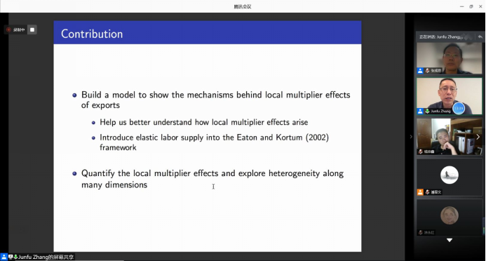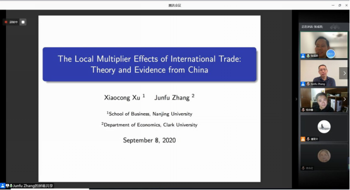 时间:2020-09-142020年9月8日晚20时,美国克拉克大学张俊富教授做客黄达-蒙代尔讲堂,使用腾讯会议在线上作了题为“国际贸易的地区乘数效应:来自中国的理论与证据 (The Local Multiplier Effects of International Trade: Theory and Evidence from China)”的学术演讲。讲座由色情动漫 副院长张成思教授主持。