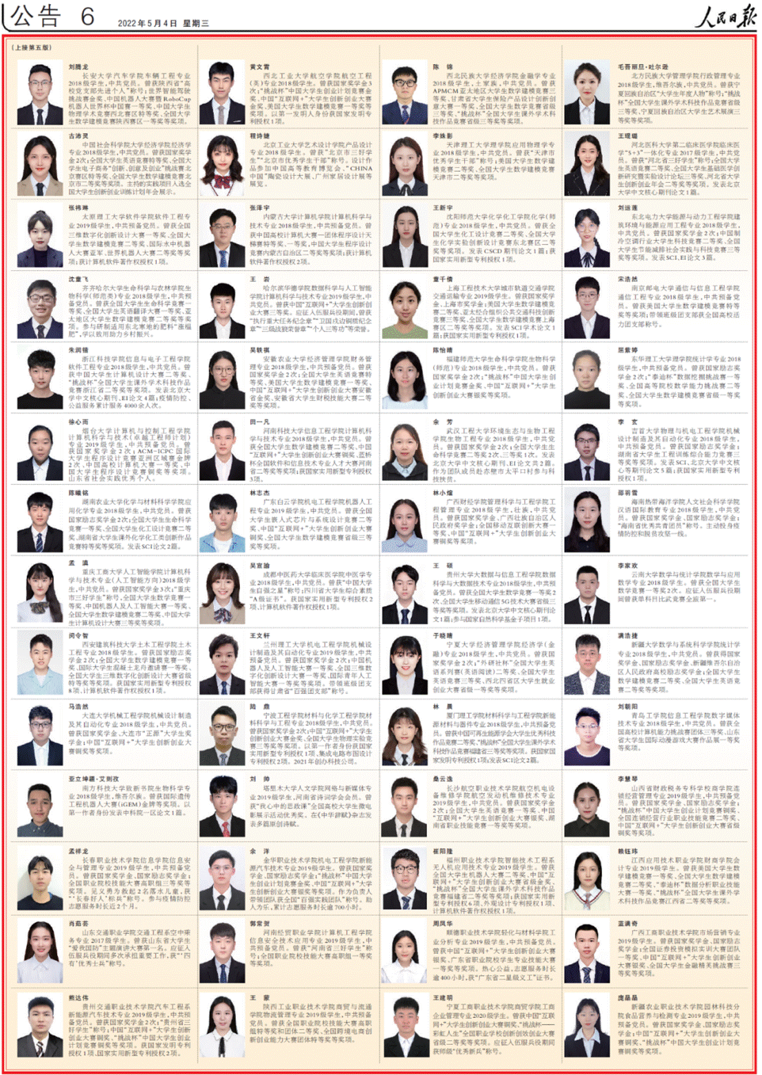 时间:2022-05-045月4日出版的人民日报,用四个整版刊登了100名本专科生国家奖学金获奖学生优秀代表和100名中等职业教育国家奖学金获奖学生优秀代表名录。我院2018级本科生周梓玉上榜!