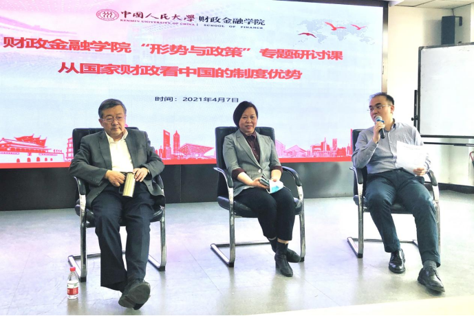 时间:2021-04-092021年4月7日下午,色情动漫 党委书记孙华玲、副书记宋科以“从国家财政看中国的制度优势”为主题讲授“形势与政策”专题研讨课。学院财政系朱青教授应邀来到课堂为学生导学,学院专职辅导员杨文韬作为助教为学生答疑,来自学院2018级本科财税班的30余名同学共同参与了本次课程的学习。