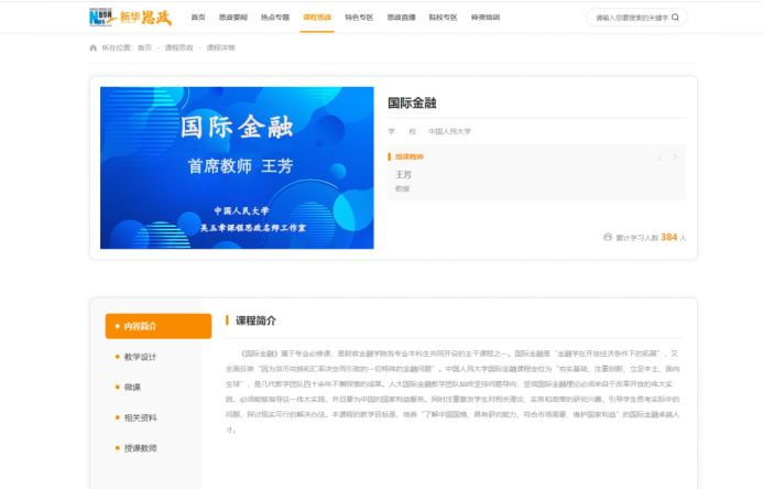 时间:2021-08-06近日,我院王芳教授主讲的《国际金融》课程入选新华网课程思政优秀案例,并已上线“新华思政”教学服务平台,面向全社会免费开放。