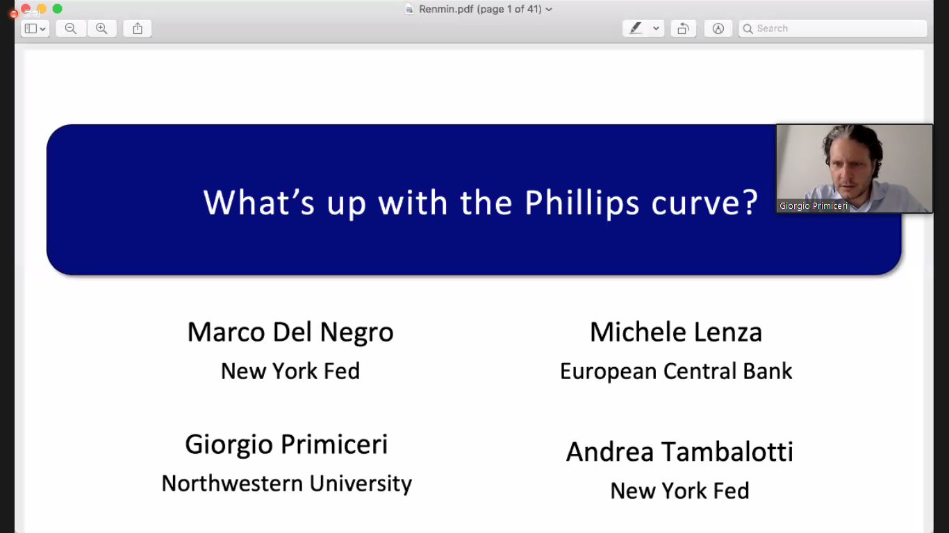美国西北大学Giorgio Primiceri教授演讲的题目是“What’s up with the Phillips curve?”。文章基于1990年来通货膨胀对经济周期响应的停滞现象,使用VAR和估计的DSGE模型研究这种连结消失的来源。 研究发现,这种脱节主要是由于通货膨胀对成本压力的反应减弱,亦即平坦的总供给曲线。朝着更强有力的通货膨胀稳定化的政策转变似乎也通过降低需求冲击对实体经济的影响起到了一定作用。证据排除了劳动力市场结构变化或其紧张程度的衡量方法等渠道。