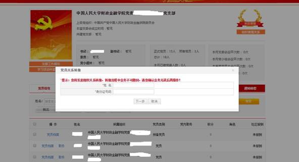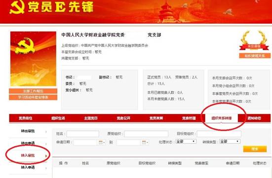 1)点击初始页面中部第一栏“党员信息”,随后点击下面“转入”。