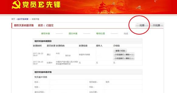 2)点击“详情”后进入组织关系详情页面,点击右上方“同意”即完成市内转入。